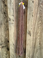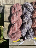 This skein is approximately 128 yards, 3.3 ounces of worsted weight English angora floof combined with sturdy dyed romney wool that has been blended with soft hybrid sheep's wool. The result is a tweedy yarn that's robust yet soft, and which will develop a halo in time. It's a light gray-orange, with tweedy pops of gray-blue-white angora fiber.